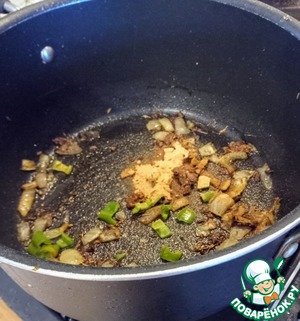 Добавить имбирь и зелёный перец чили. Перемешать и жарить 2 минуты.