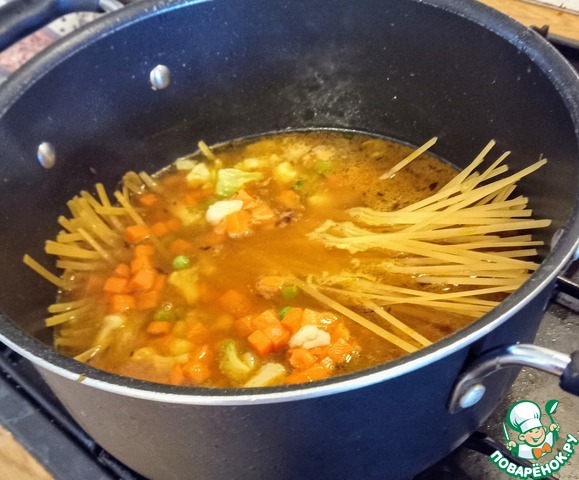 Добавить куркуму, влить бульон, вермишель и ассорти овощное. Довести до кипения, затем уменьшить огонь и тушить содержимое ёмкости под крышкой 10 минут до готовности вермишели и частичного испарения жидкости.