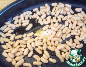 Во вторую ёмкость для запекания добавить процеженную белую фасоль, 3 столовых ложки оливкового масла и одну чайную ложку соли. Запекать в течение 30 минут, время от времени перемешивая.