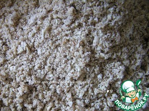 Приготовьте бисквит. Из миндаля и половины сахара сделайте миндальную муку с помощью кофемолки. Соедините миндальную муку с разрыхлителем, ванилином и пшеничной мукой, перемешайте.