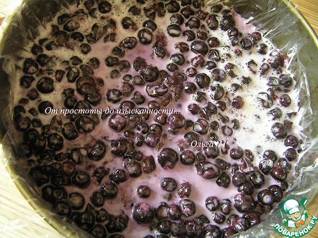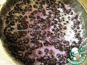 Бисквит остудите. Разъемную форму для выпечки застелите пищевой пленкой, выложите бисквит, сверху разложите ягоды. Уберите в холодильник. -