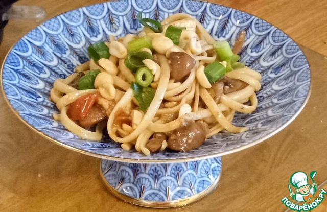 Подавать с лапшой, арахисом и 1/4 зелёного лука. Приятного аппетита!