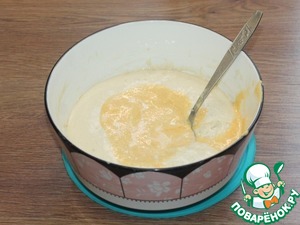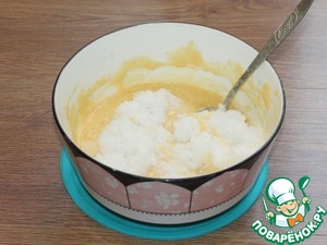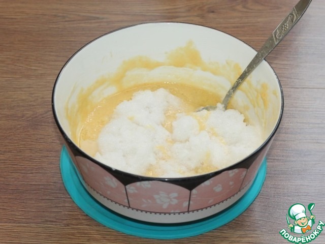 3. Приготовим тесто. Желтки (2 шт) отделяем от белков. К белкам всыпаем соль (1 щеп.), а к желткам оставшейся сахар. Отдельно желтки растираем с сахаром, солью (щепотка) и ванилином. Для цвета я добавила куркуму.