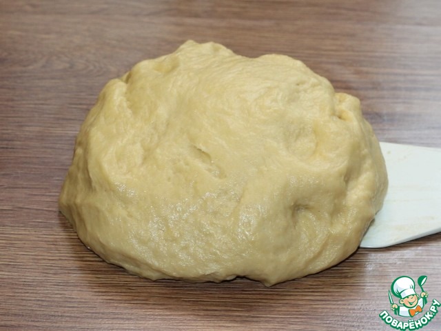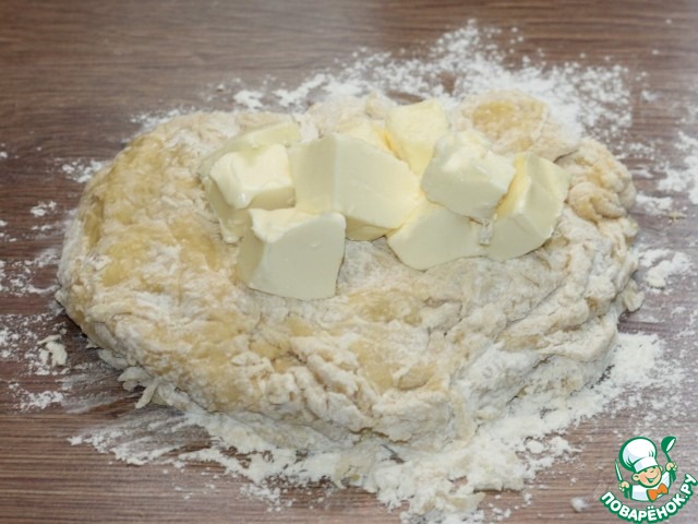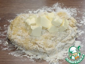 7. Выкладываем тесто на подпыленный мукой стол. Добавляем мягкое сливочное масло и вымешиваем мягкое тесто.