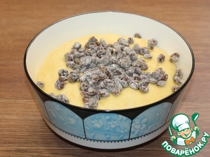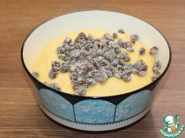13. В подошедшее тесто, добавляем изюм и хорошо его вмешиваем.