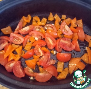 Разогрейте духовку до 200С. Выложите помидоры, перец, чеснок, оливковое масло и соль в ёмкость для запекания, желательно в один слой. Осторожно перемешать и запекать 25 минут.