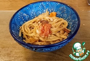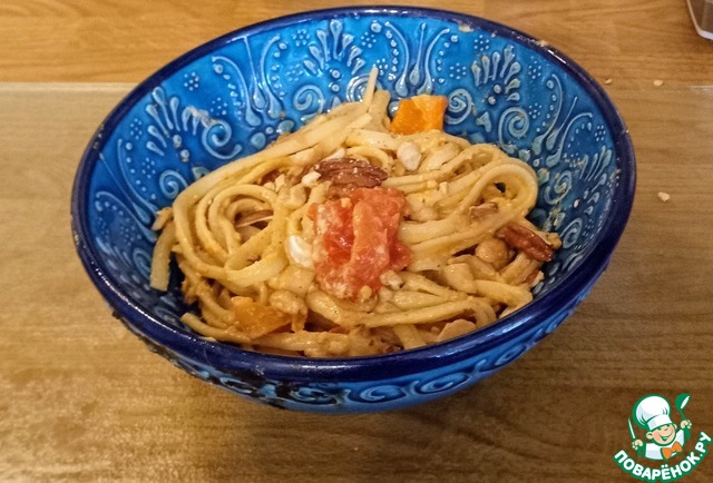 Мухаммара - вкусный ближневосточный соус из запечённых перцев и грецких орехов. Соус универсален.. Он прекрасно подходит как к запеченному картофелю, так и к креветками, к мясу и к овощам. В данном случае, предлагается перемешать его с пастой. Сыр рикотта усиливает натурально сладковатый, ореховый, пряный вкус соуса.