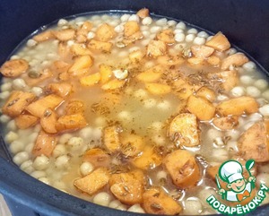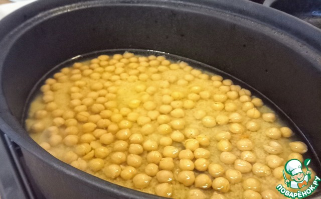 Разогрейте духовку до 200С. В форму для запекания вылейте бульон, выложите булгур и нут.