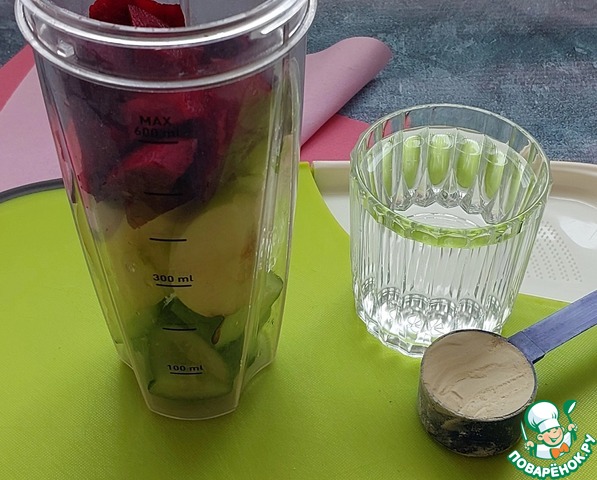 Выложить ингредиенты в стакан блендера, добавить протеин, лимонный сок и долить воды до отметки 300мл.
