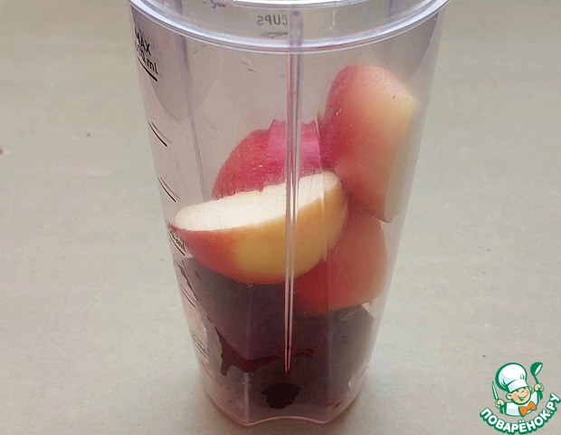 Свеклу почистить от шкурки (при желании шкурку можно оставить), крупно нарезать, яблоко очистить от семенной коробочки и тоже порезать.