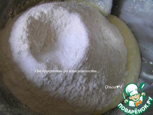 Разделите массу на 2 части, в одну часть всыпьте 150 г муки и 0,5 ч. л. разрыхлителя.