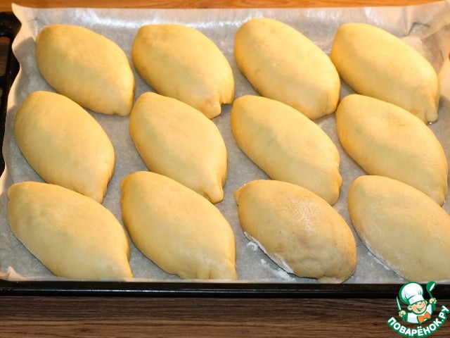 17. Выкладываем пироги на противень, на небольшом расстоянии друг от друга. Противень предварительно застилаем пекарской бумагой и смазываем маслом (растительным или сливочным).