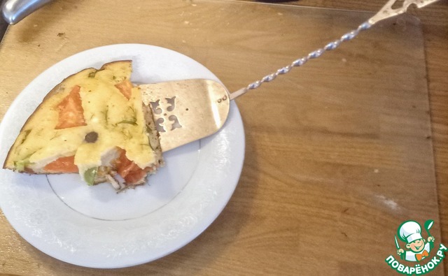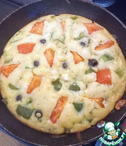 Вылить тесто в ёмкость для запекания. Разровнять. Сверху выложить единым слоем кусочки помидоров, лук, жареный перец и маслины. С помощью кисточки смазать пирог оливковым маслом