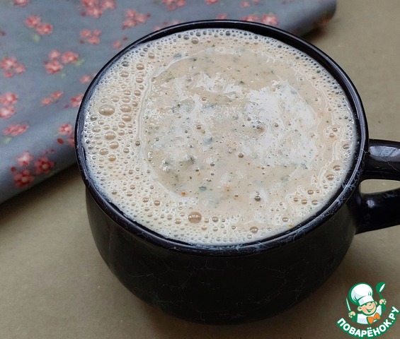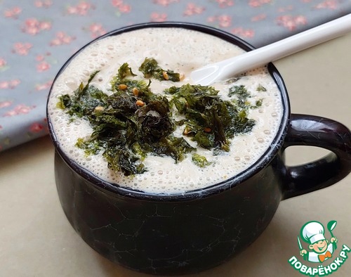 Смузи с двумя видами капусты: белокочанной и морской, с добавлением томата и топпингом из готовой жареной морской капусты.