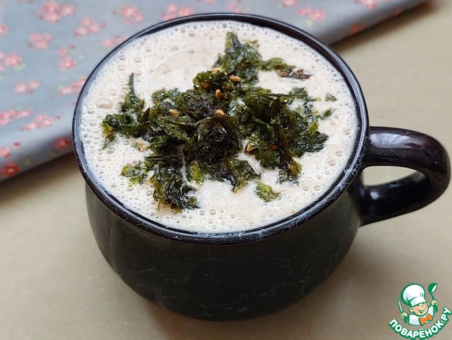 При подаче можно присыпать кунжутными семечками или как у меня: жареной морской капустой (использовалась капуста с кунжутом и вкусом острого перца). Этот топпинг обогащает вкус смузи.
