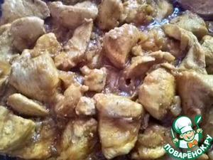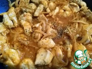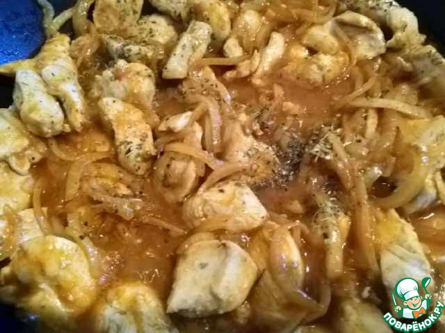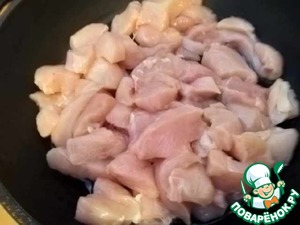 Филе нарезать на небольшие кусочки, выложить на сковороду с ложкой растительного масла. Тушить, помешивая, пока мясо не побелеет (не зарумянивать), посолить.