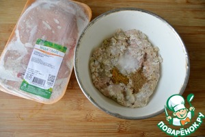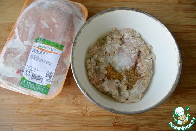 Добавляем в фарш соль, молотую смесь перцев и карри. Фарш тщательно вымешиваем и затем отбиваем, на это должно уйти минимум 10 минут.