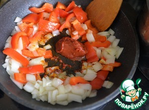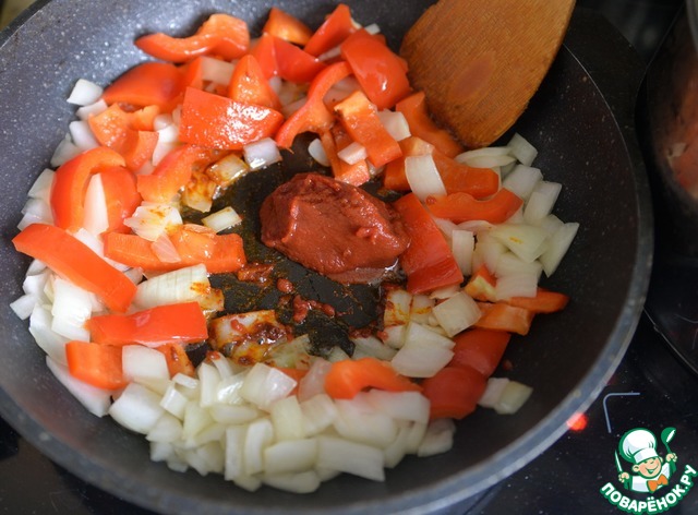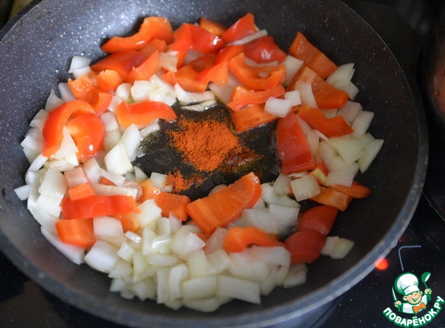 Берём сковороду или сотейник, нагреваем, наливаем масло, кладём перец, лук и чеснок, на среднем огне обжариваем 5 минут. Далее добавляем паприку. Паприка непременно должна попасть на растительное масло, тогда она раскроет свой вкус и аромат.