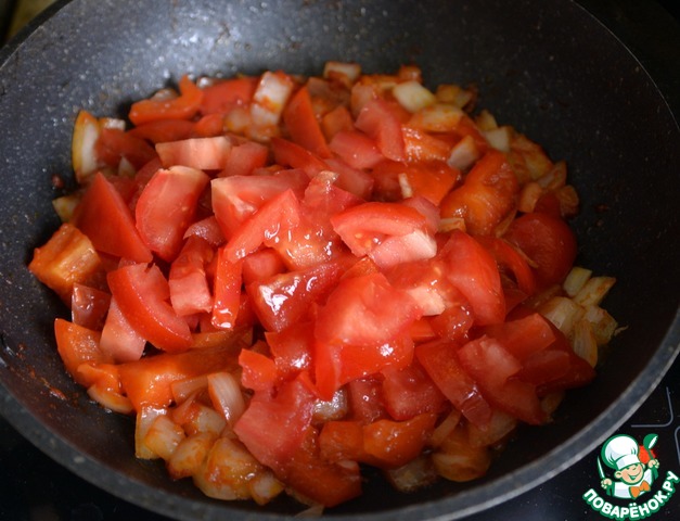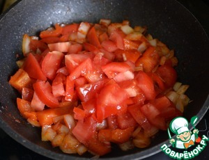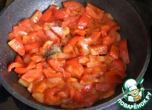 Добавляем сочные спелые помидоры, порезанные мелкими кубиками, перемешиваем. Тушим на среднем огне до полуготовности (около 10 минут).