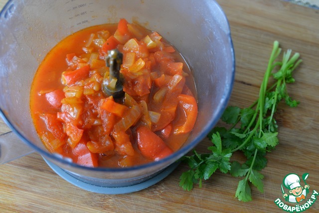 Даём соусу немного остыть, добавляем мытую кинзу, пробиваем блендером.