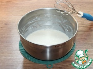 5. Пышную опару перемешиваем и добавляем, сахар 1 ст. л., 1 взбитый яичный белок, растительное масло 40 мл и взбиваем венчиком. В жидкую смесь небольшими частями, просеиваем мучную смесь, вначале 2/3 часть и перемешиваем.