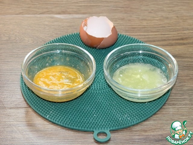 4. Желток отделяем от белка (1 яйцо). К желтку добавляем щепотку сахара и убираем в холодильник. К белку всыпаем соль 1 ч. л. (б/г) и взбиваем вилкой.