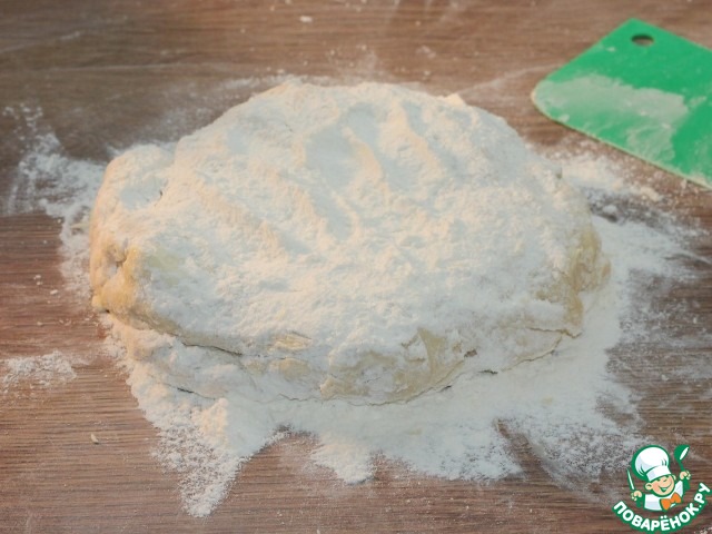 6. А затем оставшуюся муку и замешиваем немного липкое тесто.