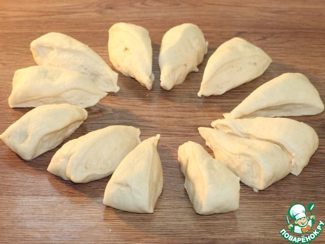 13. Делим на 12 частей и скатываем в шарики. Накрываем заготовки полотенцем и оставляем на 10 минут.