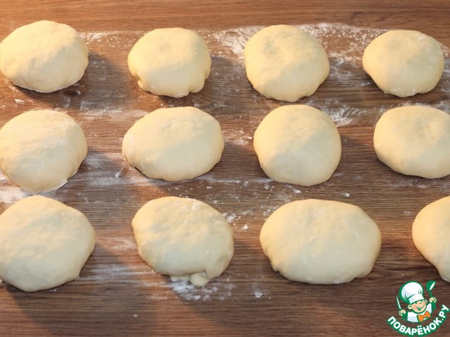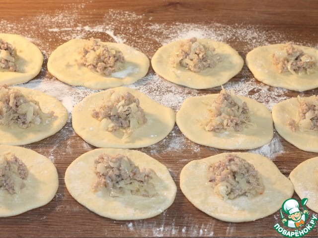 14. Каждую часть теста раскатываем в круглую лепешку с чайное блюдце и кладем начинку (1,5 ст. л.).