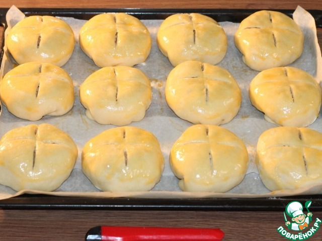 19. Через 3 минуты, когда надрезы немного увеличатся, распределяем соус. Выпекаем пирожки минут 30 при температуре 180 градусов.