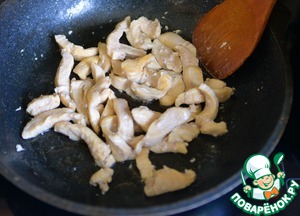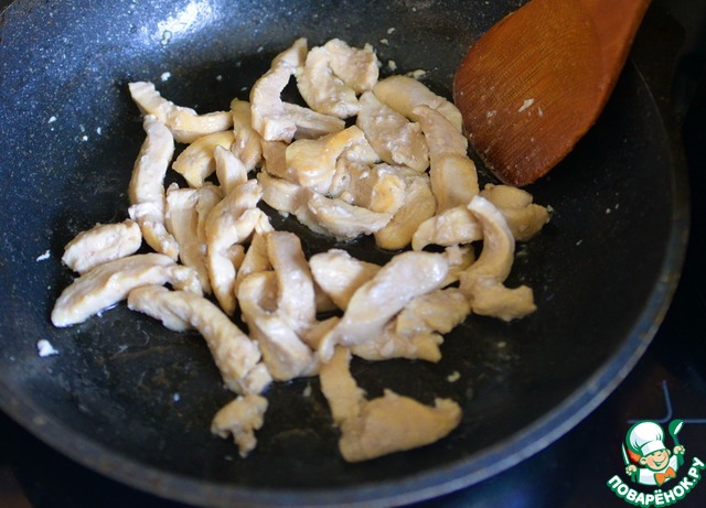 На горячую сковороду наливаем растительное масло и на среднем огне обжариваем филе индейки до лёгкого подрумянивания около 15 минут. Соль и специи не добавляем.