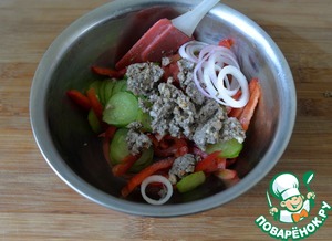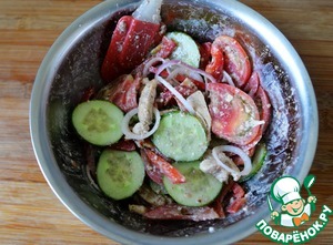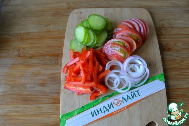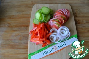 Лук режем тонкими кольцами, перец - полосками, огурцы - кружками, помидоры - половинками кружков. -