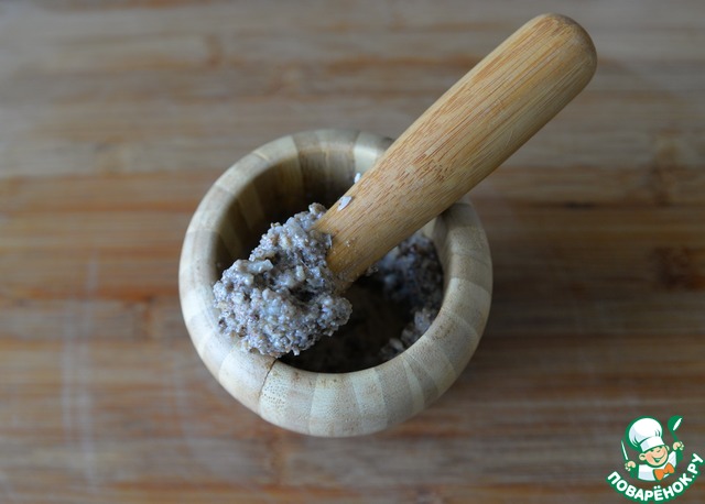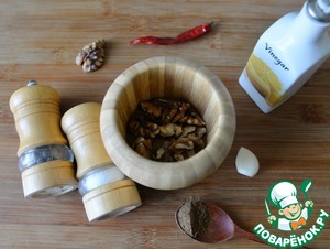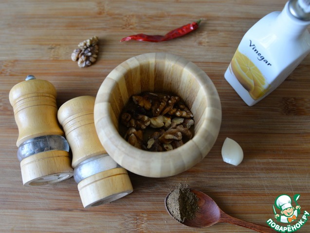 Готовим чесночно-ореховую заправку. Подсушиваем грецкие орехи пару минут на сухой сковороде, часто помешивая, чтобы они подсушились и раскрыли свой вкус. Затем пересыпаем их в ступку, добавляем чеснок, хмели-сунели, чёрный перец, хлопья перца чили и соль. Перетираем, чтобы образовалась кашица и орехи выделили масло.