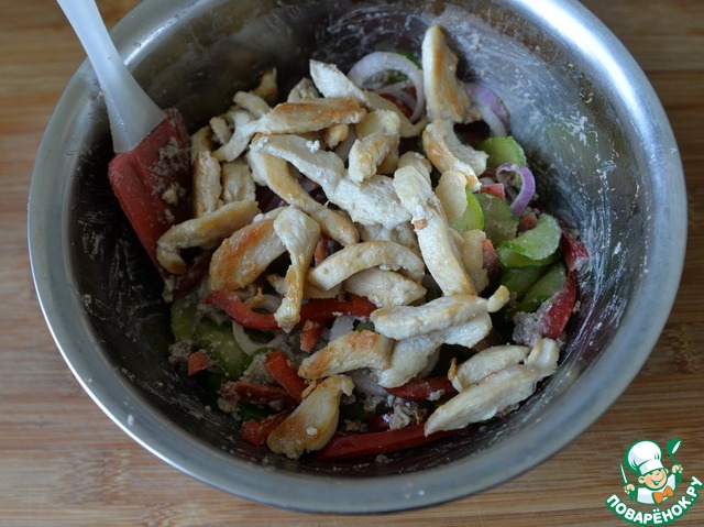 Добавляем в салат остывшее жареное филе индейки, перемешиваем.