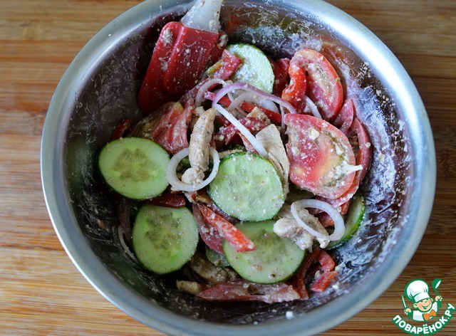 В переводе с грузинского "глехурад" означает "по-крестьянски". Чаще всего используют в салат помидоры, огурцы, перец, лук и зелень, а заправляют орехово-чесночной заправкой без растительного масла. Салат сочный и очень ярко выражен по вкусу, его часто используют к мясу и птице-гриль, шашлыку. Поэтому он очень востребован на пикниках. Предлагаю вам соединить сразу два в одном: приготовить этот салат с индейкой. Конечно, лучше использовать индейку-гриль, но при отсутствии таковой, можно добавить в салат жареное филе.