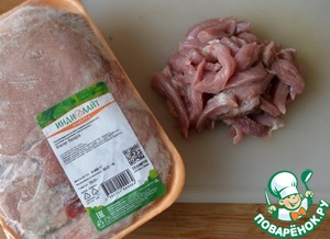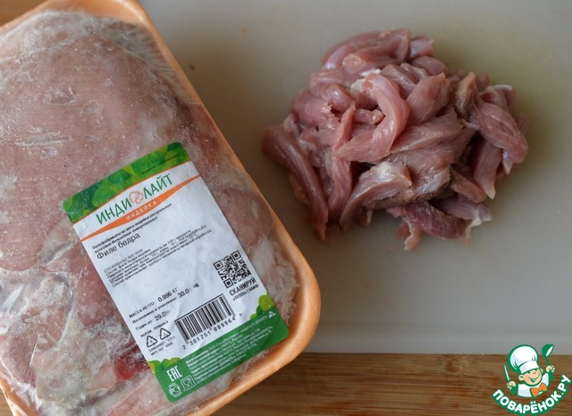 Для приготовления салата берём филе индейки. У меня - филе бедра индейки "Индилайт". Режем филе тонкими полосками.