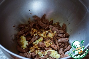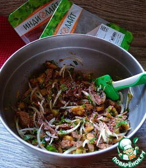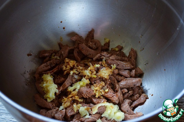 Добавить всё к мясу. Нарезать тонко лук, нарубить петрушку, добавить в салатник. Перемешать.