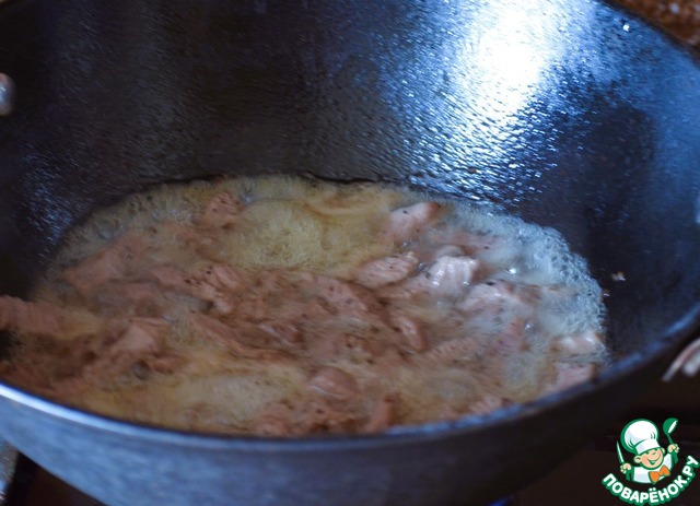 Индейку нарезать тонкими брусками, заправить перцем молотым. -