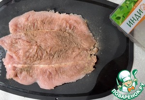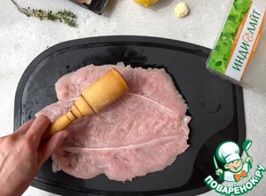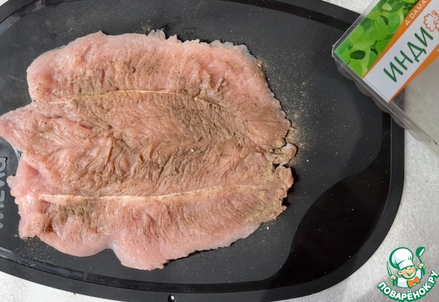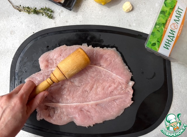Разрежьте грудку индейки и отбейте до толщины около 1,5 см.