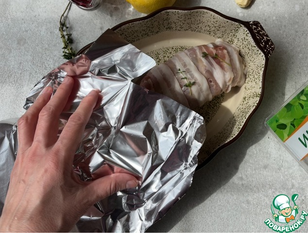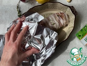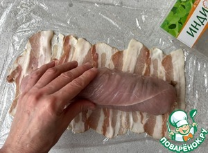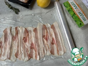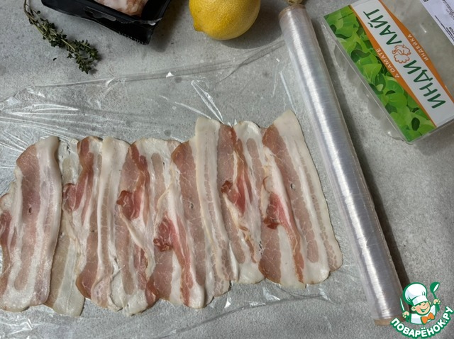 Сверху разместите наш руладин и с помощью плёнки заверните будущий руладин в бекон, плотно утягивая.