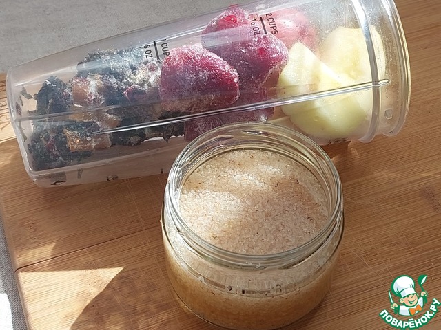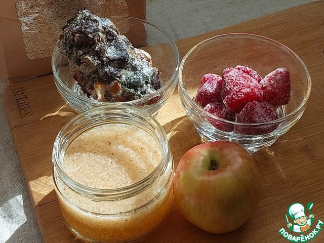 Ингредиентов немного. Амарантовые хлопья нужно замочить на ночь в сыворотке. На фото уже размоченные хлопья В принципе, можно просто добавить в смузи сухие хлопья и сыворотку. Но мне больше по вкусу первый вариант. Мангольд и клубника из заморозки. Яблоко небольшое. Можно не добавлять яблоко, а увеличить количество клубники.