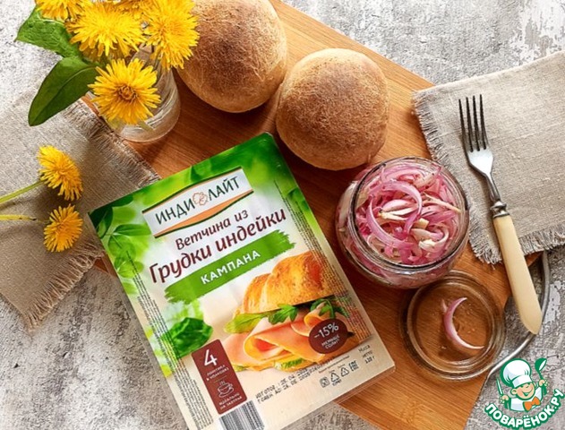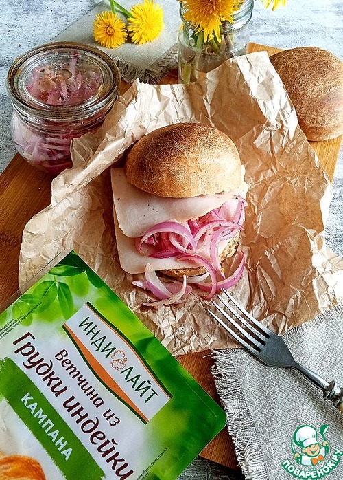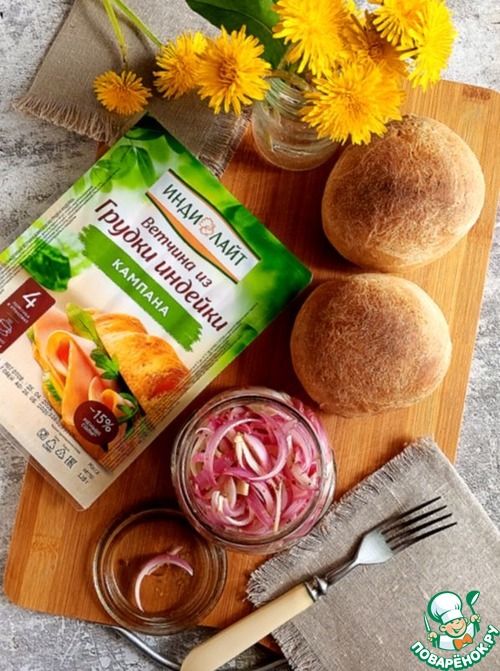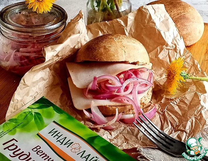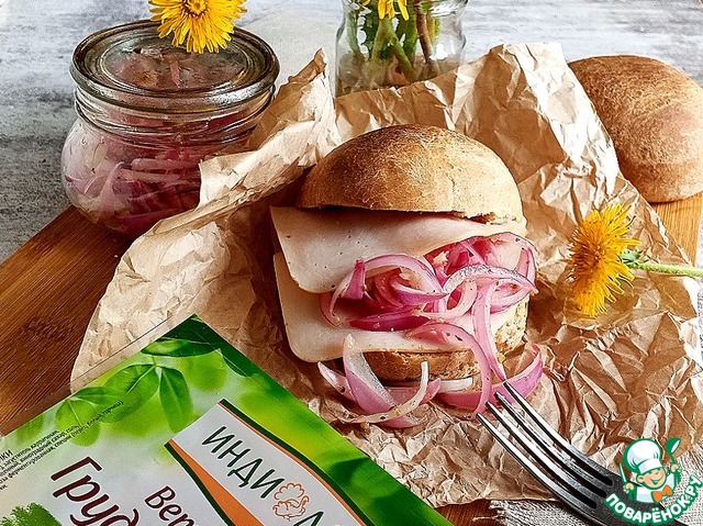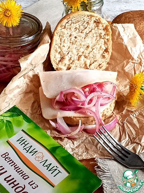 Салат всего лишь из одного ингредиента - красного лука. Всё дело в заправке. Незаменимая часть пикника. Можно подавать с любым мясом, шашлыком, делать с ним бутерброды и есть просто с хлебом. Сегодня я вам предложу бутерброды на домашних ржано-цельнозерновых булочках с ветчиной из индейки и этого салата. Пробуйте!