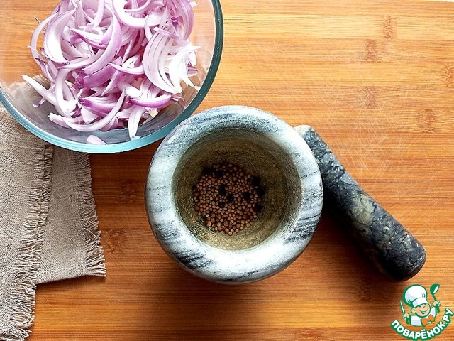 Перец чёрный, горчицу и кориандр берите целиковые. Растолчите в ступке. Будет от этих специй яркий аромат только что помолотых специй. Лук помещаем в салатник.