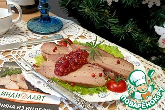 Подаём индейку, как холодную закуску или, как горячее блюдо. При подаче нарезаем на кусочки. Запечённые лук с яблоками - соус к блюду. Приятного аппетита!