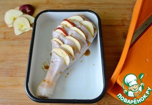 Яблоко режем тонкими слайсами, чистим от семян, кожуру оставляем. В разрезы на голени вставляем слайсы яблок.