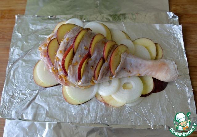 Фольгу складываем для надёжности в несколько слоёв ( у меня три слоя). Лук нарезаем кольцами. Кладём на фольгу слой лука с оставшимися яблоками. На них кладём голень индейки.
