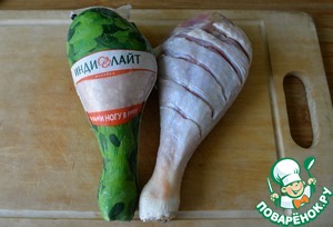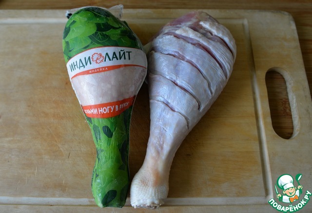 Берём голень индейки, у меня - Индилайт. Голень индейки моем, обсушиваем салфеткой, делаем поперечные глубокие надрезы вдоль всей голени.