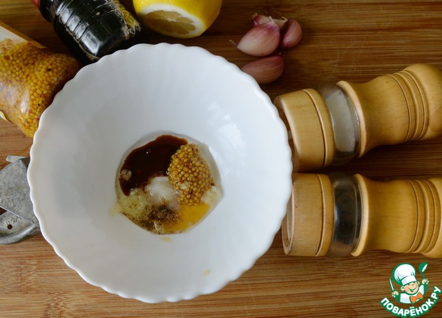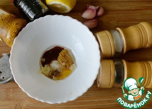 Готовим маринад. Смешиваем горчицу с зёрнами, мёд, соевый соус, сок лимона, добавляем соль, чёрный перец, выдавливаем чеснок.