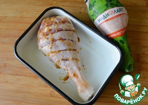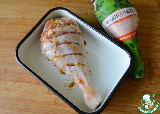 Натираем голень индейки маринадом так, чтобы маринад попал и в разрезы. Оставляем минимум на час. Чем дольше, тем мягче будет индейка.