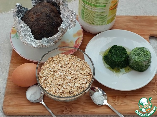 Ингредиенты коржа. Хлопья овсяные нужно смолоть в кофемолке. Можно использовать и овсяную муку, тоже хорошо получится, только рулет будет менее фактурным. Свеклу предварительно приготовить удобным способом, я запекаю в фольге. Со шпината жидкость сливать не следует. Так же можно использовать специи по вкусу. Я кроме соли ничего не добавляю.